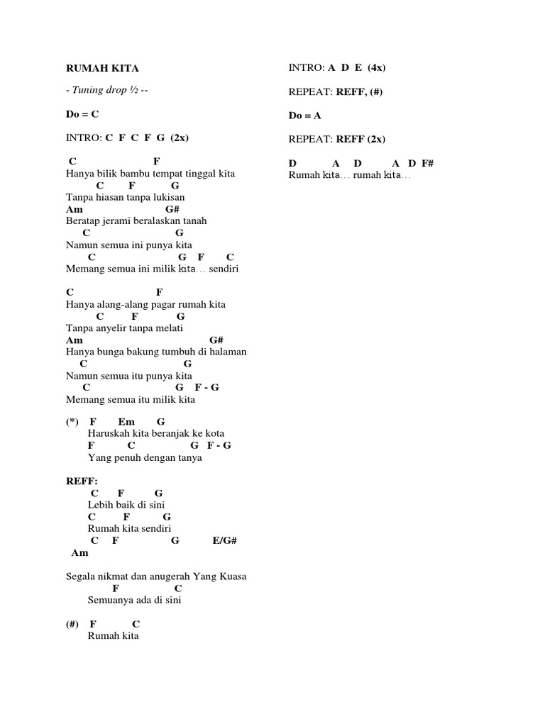 Versi original Godbless A D E Lebih baik disini A D E Rumah kita sendiri A D E Segala nikmat dan anugerah Cm Fm Yang Kuasa D A Semuanya. Berikut kunci chord gitar dan lirik lagu Rumah Kita - God Bless. Am - G C Ratapanmu mengiringi Am - G C Kepergian kali ini Am - G C Sungguh ku benci tinggalkan Am - G C Tempat kita rajut mimpi F Fm Bersabarlah sejenak.